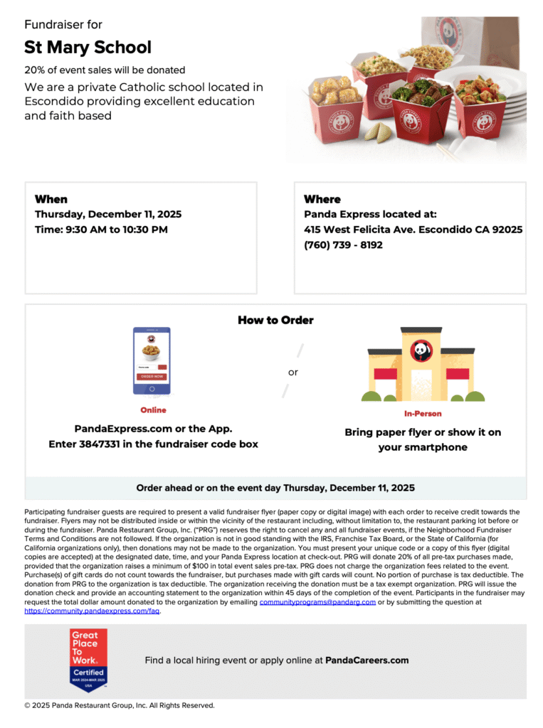 December’s Dinner Night Out is on 12/11/25 9:30am-10:30pm at Panda Express on West Felicita Ave!