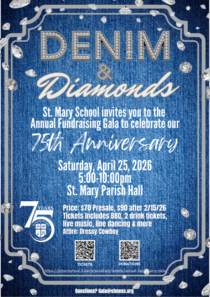 Join us as we celebrate a historic milestone, 75 years of Catholic education at St. Mary School, with a special anniversary gala you won’t want to miss. This year’s Denim & Diamonds Gala brings the celebration back to where it all began: on campus, at the heart of our St. Mary community.